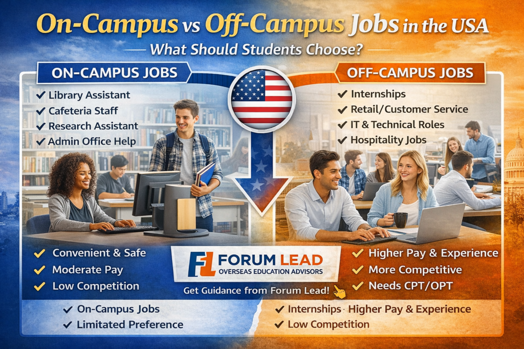 On-Campus vs Off-Campus Jobs in the USA – What Should Students Choose? On-Campus vs Off-Campus Jobs in the USA – What Should Students Choose? 6 Introduction For students planning to study in the United States, managing expenses and gaining work experience are key priorities. International students often explore part-time job opportunities to support their finances […]