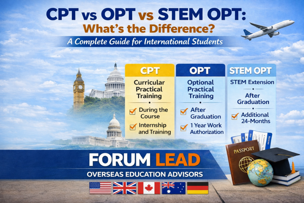 CPT vs OPT vs STEM OPT: What’s the Difference? A Complete Guide for International Students CPT vs OPT vs STEM OPT: What’s the Difference? A Complete Guide for International Students Planning to study in the USA comes with exciting opportunities—but also important decisions about work options during and after your studies. Many international students often […]