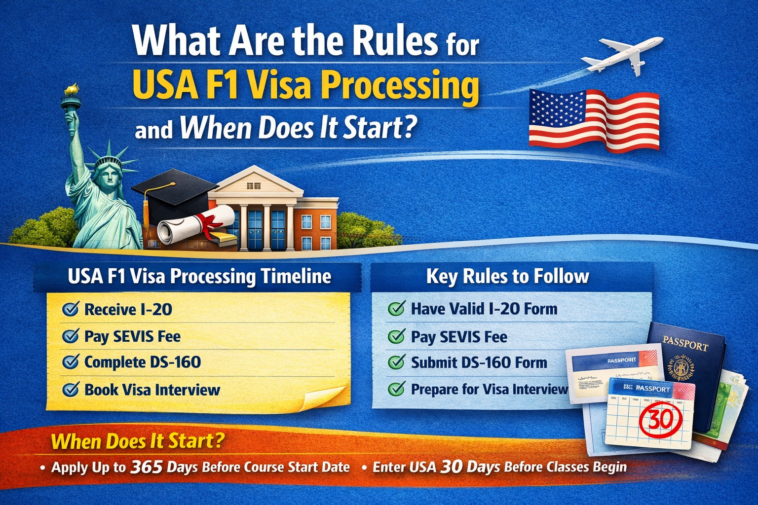 Understanding what are the rules for USA F1 visa processing and when does it start is essential for every student planning to study in the US. The process begins after receiving your I-20 form and involves several important steps like paying the SEVIS fee, submitting the DS-160 form, and attending the visa interview.